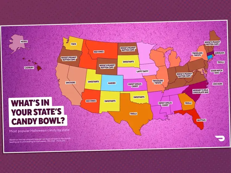 Reese's Peanut Butter Cups remain America's favorite Halloween candy, according to new DoorDash data. The company ranked the nation's favorites with M&M's second and Hershey's Milk Chocolate Bar third. Snickers, Skittles, Nerds, Sour Patch Kids, Twix, Kit Kat, and Airheads complete the top ten. Reese's dominates 14 states including Pennsylvania, Ohio, and Vermont. Sweet Smiles leads six southern states while Twizzlers favors five northern midwest locations. Nostalgic treats show surprising growth with Baby Bottle Pops up 641% and Lemonheads rising 118%. Even raisins jumped 522% in 2024.